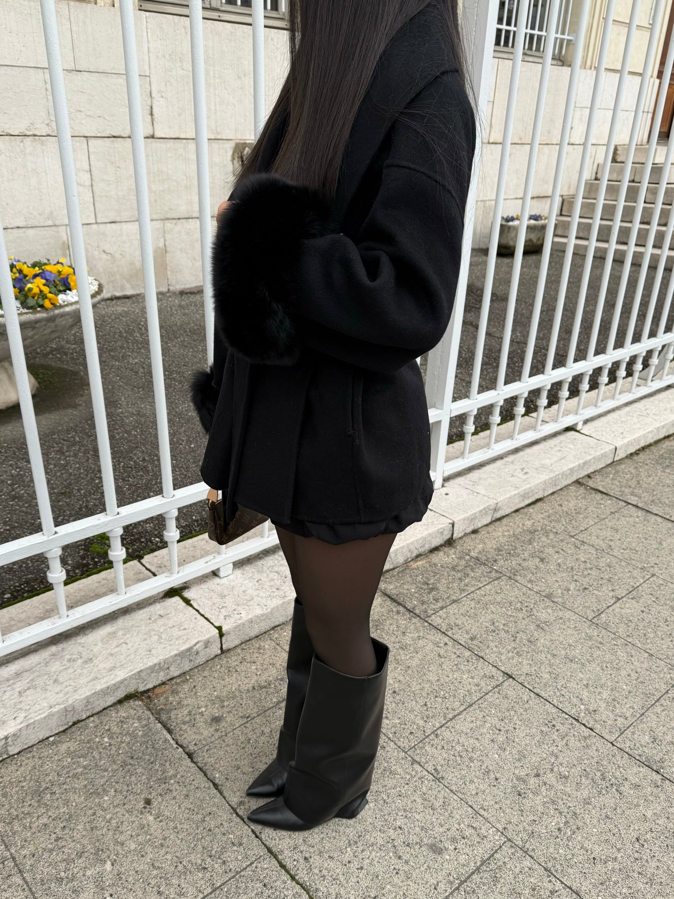 The soft faux fur accents on the sleeves elevate the look, making this jacket ideal for both casual and more sophisticated occasions.